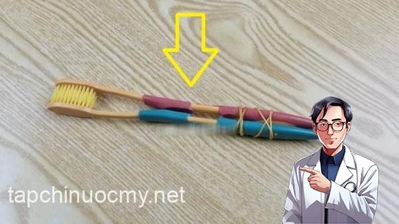 Dùng hai chiếc bàn chải đánh răng cũ, buộc chặt bằng dây chun sao cho lông bàn chải hướng vào nhau. Sau đó, nhúng vào nước và chà lên vòi nước. Cách này giúp dễ dàng loại bỏ bụi bẩn và cặn bám trong các khe hẹp, nơi khó làm sạch bằng giẻ lau thông thường.